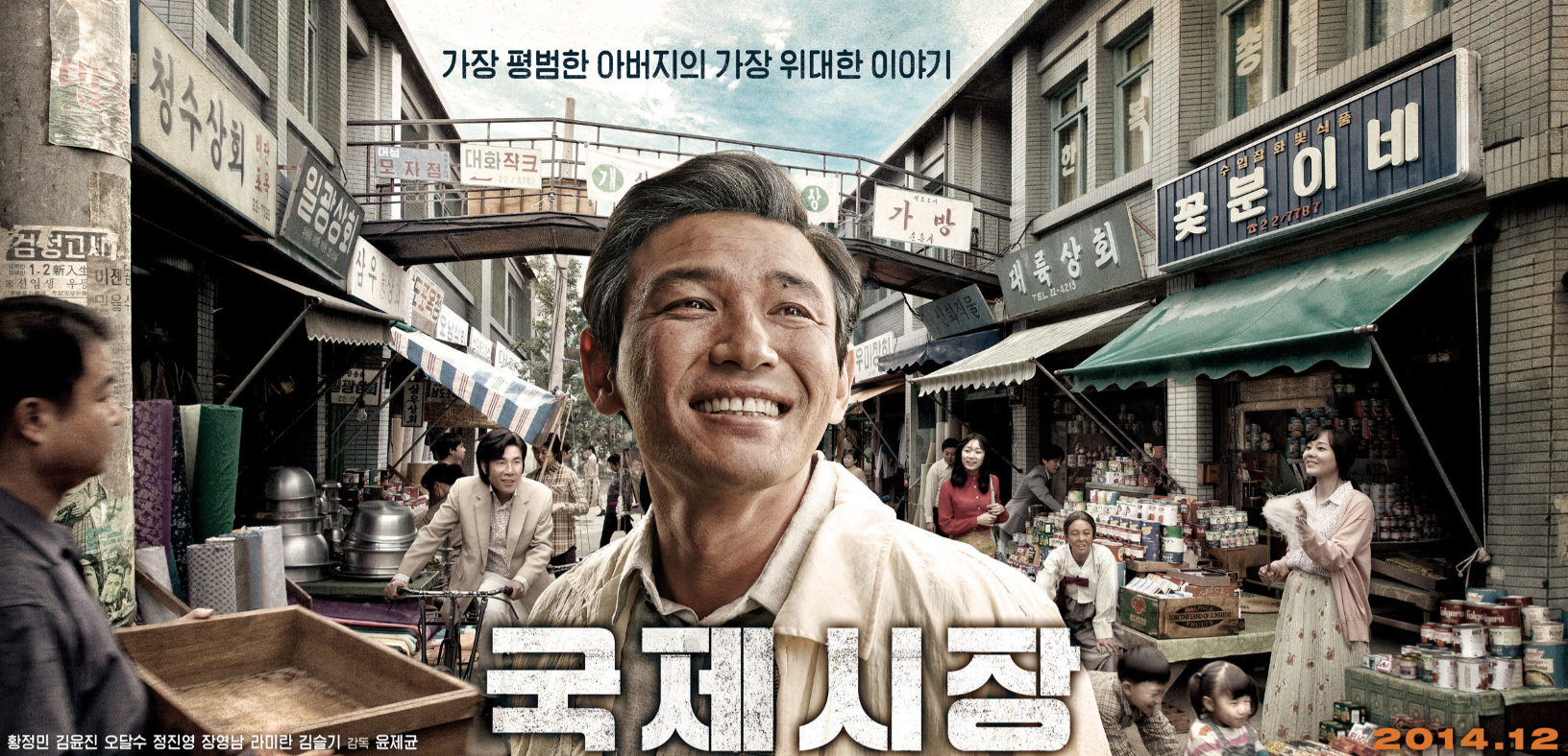 국제시장'은 2014년 12월 17일 국내 개봉한 윤제균 감독의 드라마 영화입니다. 1950년대 한국전쟁 이후부터 현재에 이르기까지 격변의 시대를 관통하며 살아온 우리 시대 아버지 '덕수'의 이야기를 그립니다. 황정민, 김윤진, 오달수 등 실력파 배우들의 열연으로 화제를 모았으며, 가족을 위해 평생을 헌신한 아버지 세대의 삶을 감동적으로 그려냈습니다. 한국 현대사의 주요 사건들을 배경으로 한 이 영화는 관객들에게 깊은 울림을 주며 큰 사랑을 받았습니다.